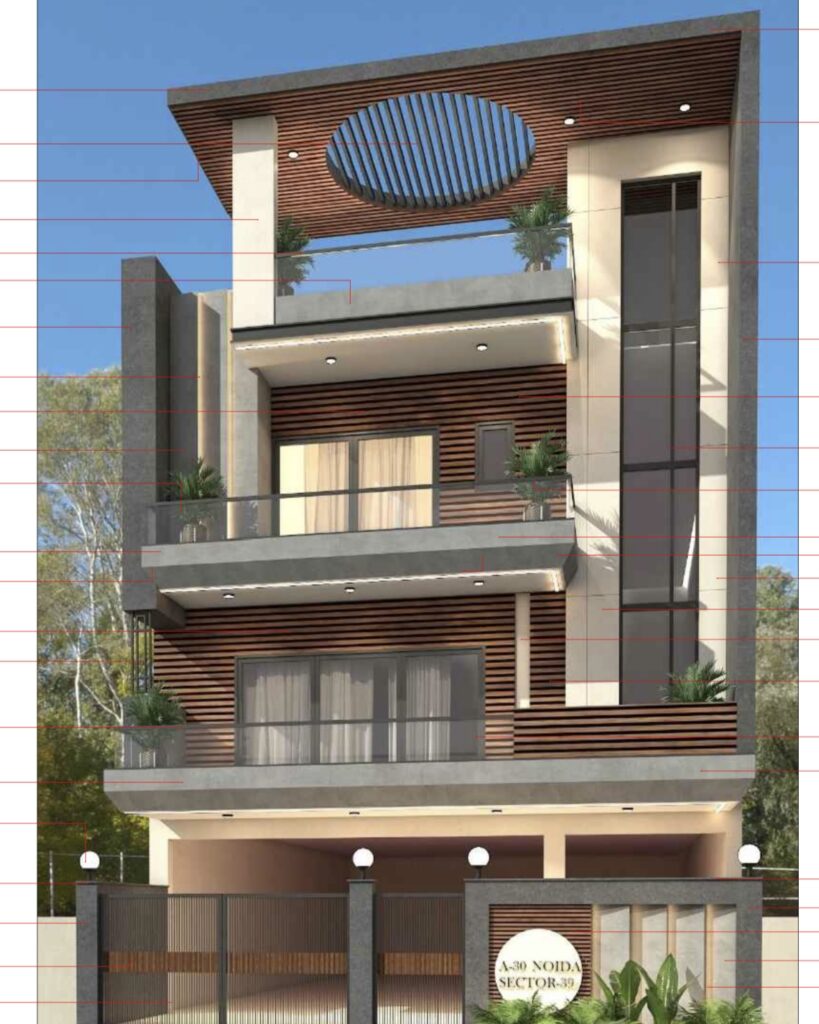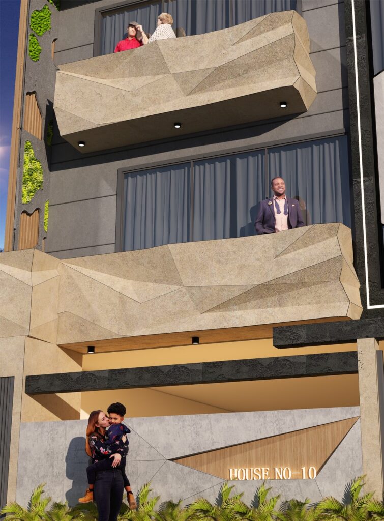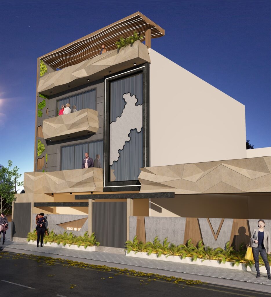 A modern concept-driven residential design defined by bold architectural geometry, layered façade elements, and contemporary material expression, creating a distinctive and dynamic urban residence.